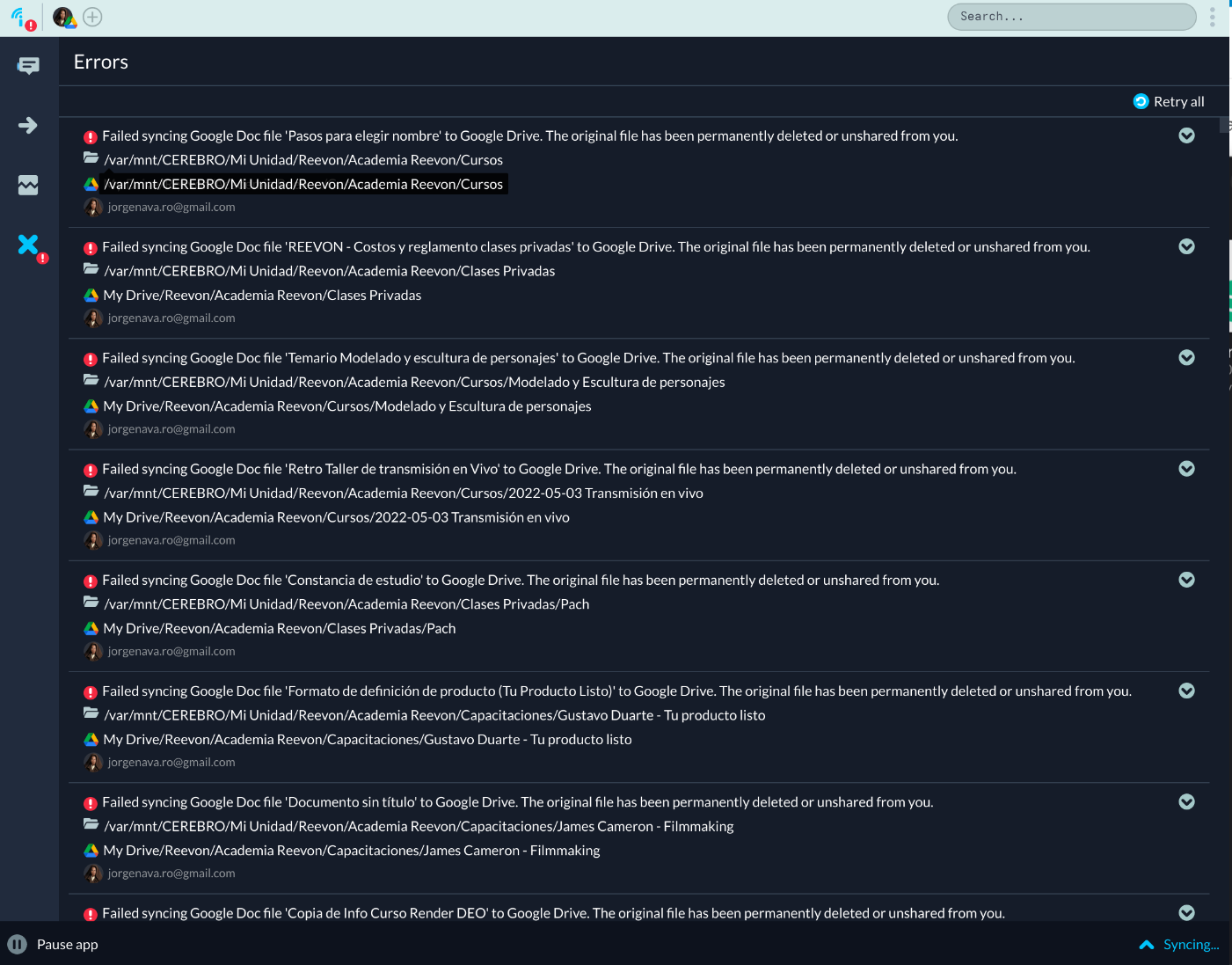 Don’t know why, suddenly appeared a LOT of errors (maybe a thousand?) saying that my google files (docs, sheets, slides) were deleted or unshared by the propietary, but I’m the propietary and didn’t deleted them, they are still in my computer.