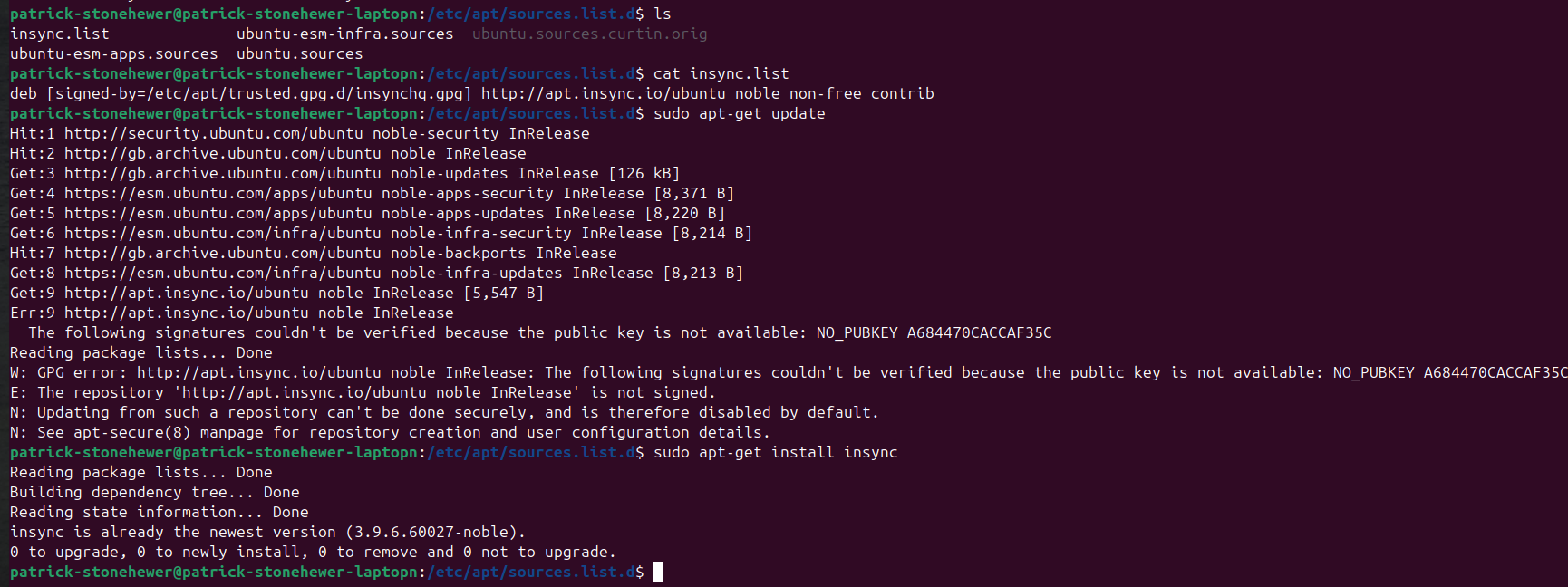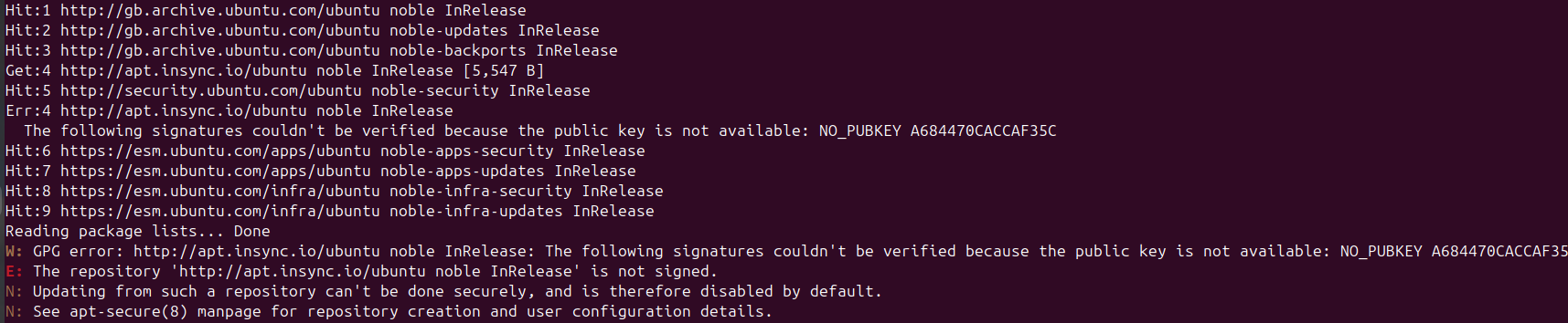 W: GPG error: http://apt.insync.io/ubuntu noble InRelease: The following signatures couldn’t be verified because the public key is not available: NO_PUBKEY A684470CACCAF35C
