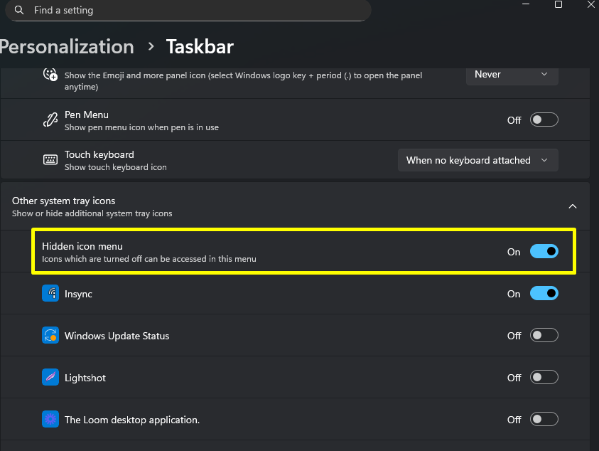 As for hiding the Insync icon, let me know if dragging it towards the upward arrow helps.